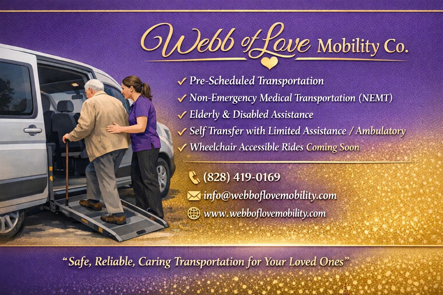 Webb Of Love Mobility is proudly operated with dedication, heart, and hands-on care. As a growing company, every ride is personally managed to ensure safety, professionalism, and reliability.